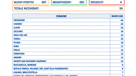 497 i nuovi casi in provincia di Frosinone, sulla base di 3557 tamponi processati. Ci sono però 4 decessi: due