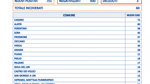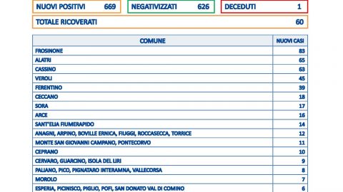 Frosinone – Sono 669 i nuovi casi ed un decesso nelle ultime 24 ore in provincia di Frosinone. La vittima