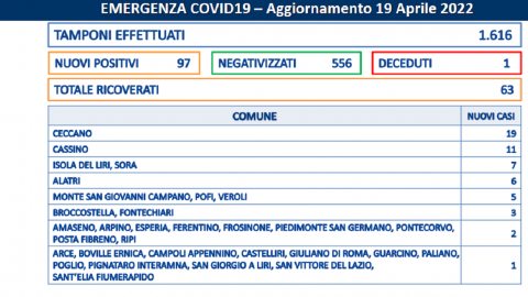 Sono 97 i casi di positività al Covid in Ciociaria. Sono 1616 i tamponi processati. L’indice è al 6 per