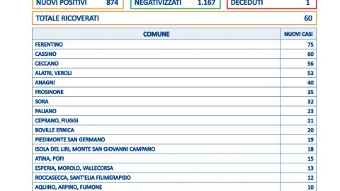 Quasi 1200 guariti, ma anche 874 nuovi casi. Sono i numeri del bollettino della Asl di Frosinone: positivi che emergono