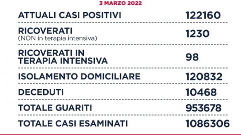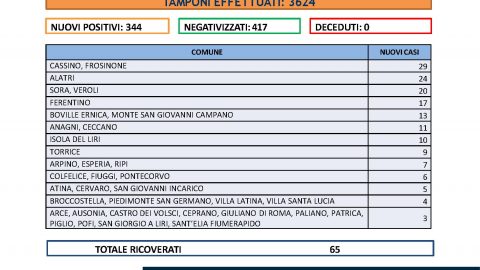 FROSINONE – 03 MAR – Sono 344 i nuovi casi in provincia di Frosinone su 3624 tamponi processati. Il rapporto