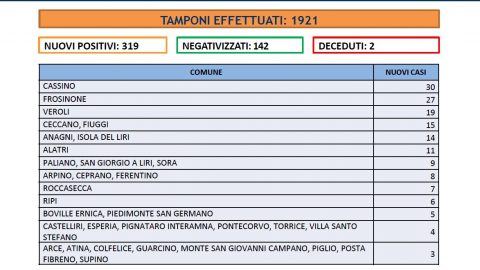 In provincia di Frosinone sono 319 i nuovi casi su 1921 tamponi processati, il rapporto è al 16,6%. Due i