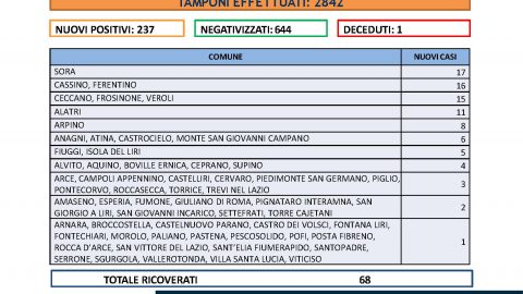Sono 237 i nuovi casi positivi al Covid nelle ultime 24 ore in provincia di Frosinone. Si conta anche un