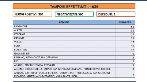 In provincia di Frosinone 304 nuovi casi emersi su 1636 tamponi processati, il tasso di positività al 18,58%. C’è un