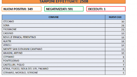 Sono 349 i positivi al Covid in Ciociaria. 2508 i tamponi processati. il rapporto è al 13,9 per cento. C’è