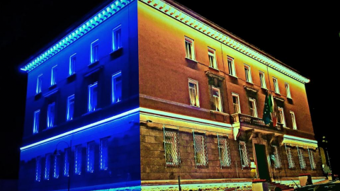 Il Palazzo comunale di Frosinone è illuminato di blu e giallo, i colori della bandiera ucraina. L’iniziativa di solidarietà e