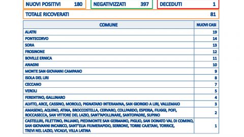 Sono 180 i nuovi casi positivi al Covid in provincia di Frosinone, con un decesso, un dato contenuto come ogni