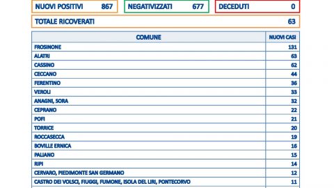 FROSINONE – Sono 867 i nuovi casi in provincia di Frosinone su 4.073 tamponi processati. Il tasso di positività resta