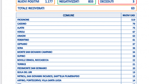 Sfondata quota 1100 positivi al Covid Risalgono in maniera vertiginosa i contagi n Ciociaria. I nuovi positivi sono 1177 su