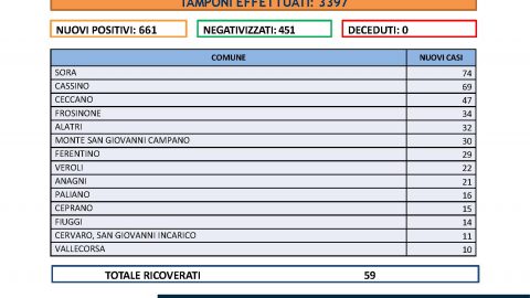 FROSINONE – 13 MAR – Sono 661 i nuovi casi in provincia di Frosinone su 3397 casi processati. Il tasso
