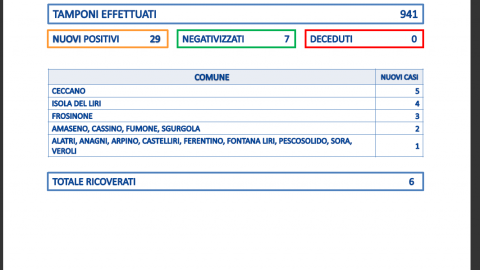 Sono 29 i positivi al Covid in Provincia di Frosinone su 941 tamponi processati. Il rapporto è al 3 per