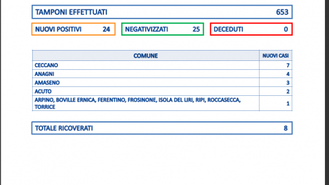 FROSINONE/LATINA – 17 OTT – Sono 24 i nuovi casi in provincia di Frosinone su 553 tamponi processati. Il tasso