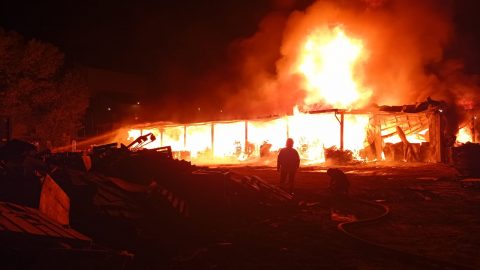 Fiamme altissime visibili dalla vicina autostrada. Un rogo si è propagato in serata all’intento di un deposito di legname nella