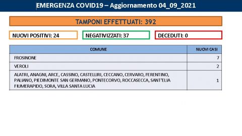 È arrivato anche il bollettino aggiornato della provincia di Frosinone, quello aggiornato alle ultime 24 ore: sono 24 i positivi