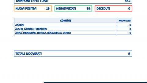 FROSINONE – 03 SET – Nelle ultime 24h sono stati effettuati 442 tamponi in provincia di Frosinone.Sono stati registrati 16