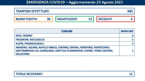 Ancora 30 casi in provincia di Frosinone, la metà rispetto a quelli registrati nella giornata di martedì. Sono emersi da