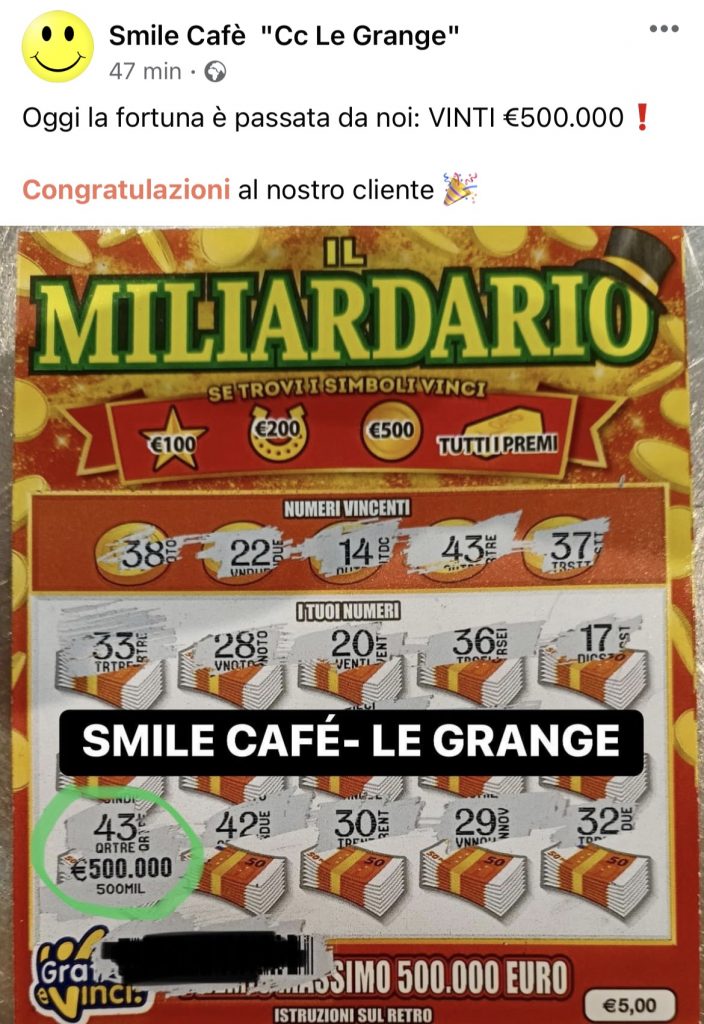 Si tratta di un cliente del bar cui ha portato fortuna il numero 43, quello che era tra i suoi numeri vincenti e che gli ha regalato mezzo milione di euro.