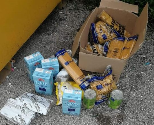 Confezioni di pasta, latte, biscotti e scatolame: ovvero un intero pacco alimentare della Caritas che è stato abbandonato a Piedimonte San Germano, vicino a un cassonetto giallo per la raccolta degli abiti usati.