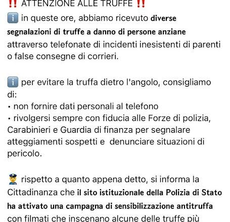 I trucchi che sono stati utilizzati in queste ore sono i classici, quelli più usati: per esempio corrieri che devono consegnare pacchi da pagare, contenenti, dicono i truffatori, cose di valore per figli o nipoti. E se i soldi contanti non si hanno in casa, vanno bene anche oggetti in oro. E poi il più subdolo dei meccanismi: falsi incidenti che avrebbero visti coinvolti parenti, magari assicurazioni non in regola e soldi da pagare subito per evitare problemi giudiziari, puntando quindi sulla fragilità emotiva delle vittime. Insomma, biechi espedienti per trarre in inganno persone fragili. Il sindaco ha dato una serie di consigli, chiedendo di non fornire dati personali al telefono e di rivolgersi sempre con fiducia alle forze dell’ordine per segnalare atteggiamenti sospetti o eventuali dubbi. Ha poi segnalato la campagna della polizia di stato per evitare di incappare nei truffatori. Occhi aperti insomma e in caso di problemi, chiamare il 112.