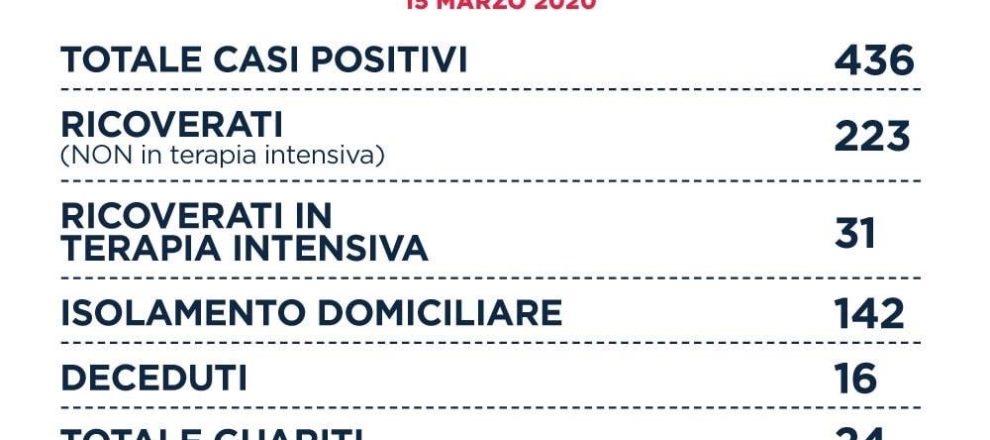 Sono 436 dall’inizio dell’emergenza i casi di positività al Coronavirus registrati nella nostra regione. Di questi 142 sono in isolamento domiciliare, 223 sono in ospedale e di questi 31 in terapia intensiva. Il conto dei deceduti nelle ultime ore è salito a 16 mentre i guariti totali sono 24. Questi i dati che sono stati rilasciati in giornata dall’assessorato alla salute della Regione Lazio.