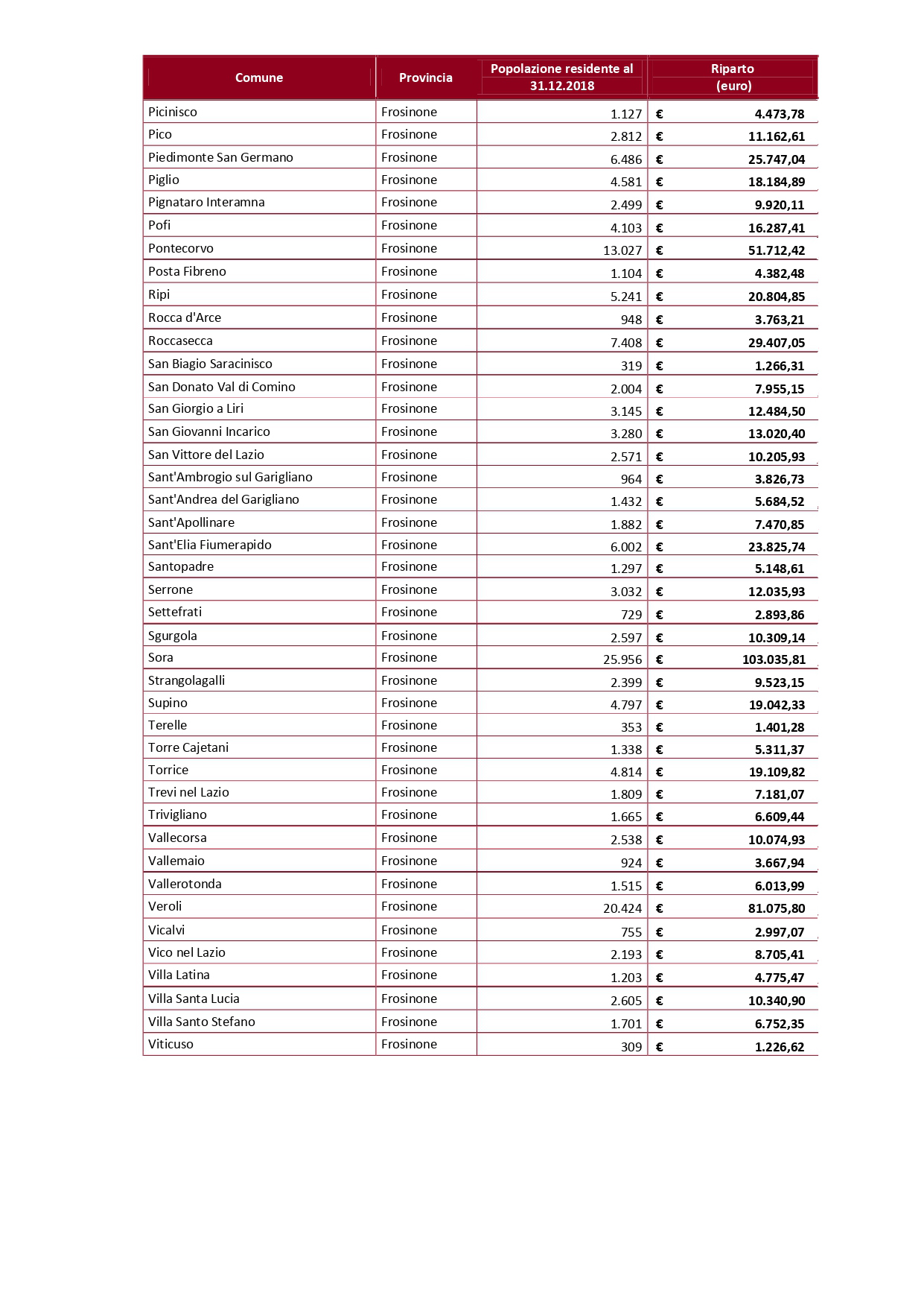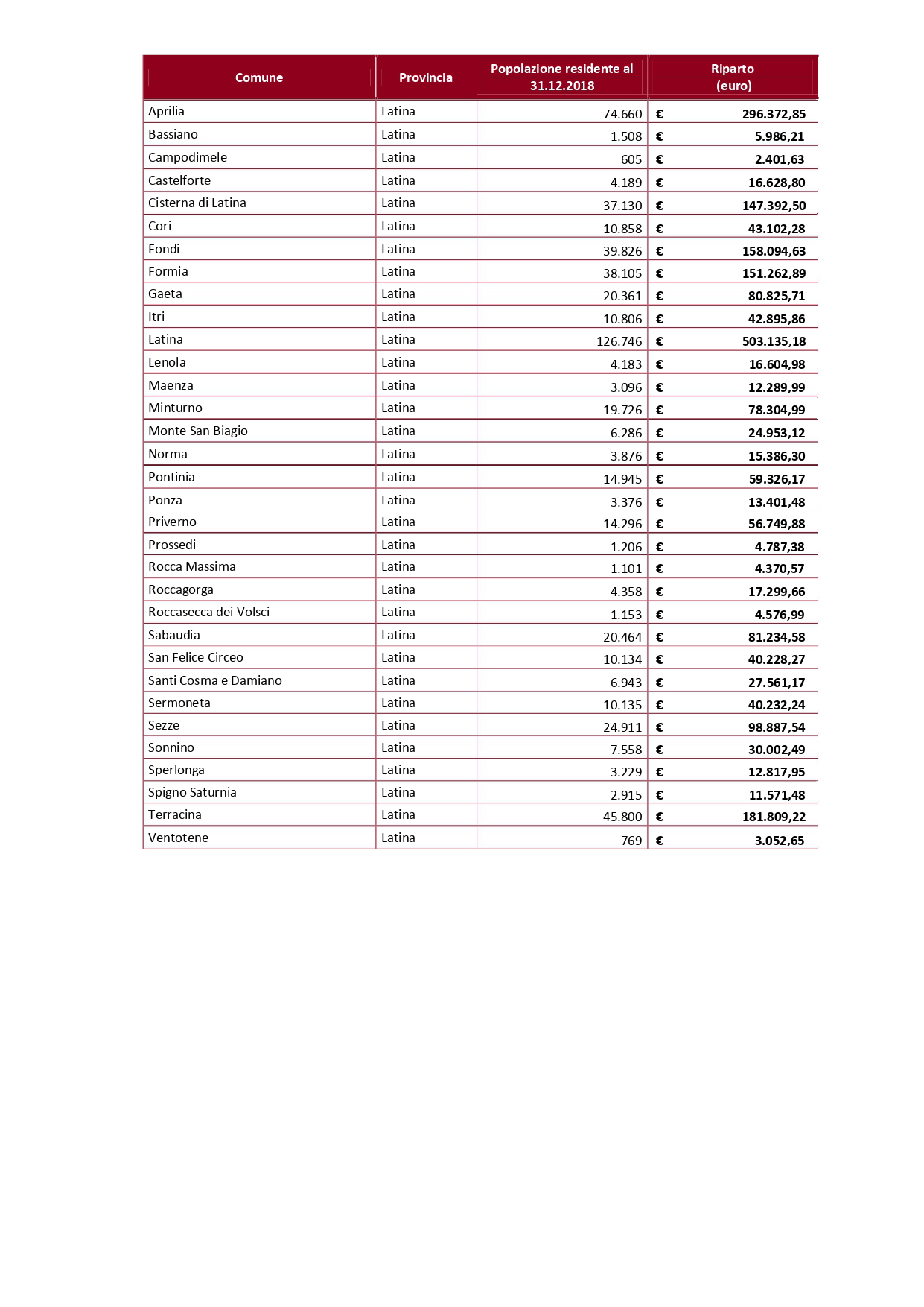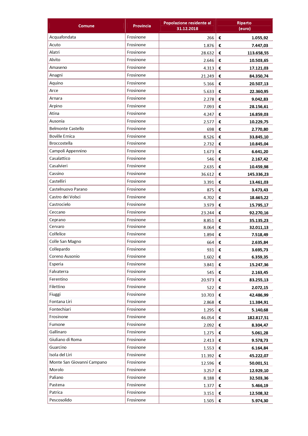 A Frosinone verranno assegnati 182 mila euro, a Cassino 145 mila euro, ad Alatri 113 mila, per Sora 103 mila euro, a Ceccano 92 mila e ad Anagni 84 mila, 83 mila a Ferentino e a Pontecorvo 51 mila euro. Nel pontino arriveranno a Latina 503 mila euro, ad Aprilia 296 mila euro, a Terracina 181 mila euro, mentre a Cisterna di Latina 158 mila euro, a Formia 151 e a Fondi 147 mila, a Gaeta invece 80 mila euro.