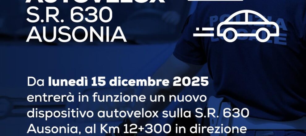 Da lunedì 15 dicembre sarà attivo il nuovo autovelox installato sulla Strada Regionale 630 Ausonia, al chilometro 12+300, in direzione Formia–Cassino, nel territorio di San Giorgio a Liri.