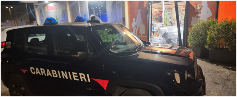 Hanno scardinato la grata in ferro della porta d’ingresso del supermercato di Sonnino nel quale volevano colpire, con l’aiuto di un furgone, poi si sono introdotti all’interno ed hanno por-tato via la cassaforte con all’interno circa 20mila euro in con-tante.