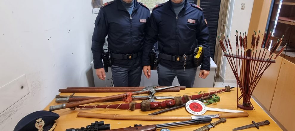 Spade, lance, archi, frecce, pugnali e baionette. E’ quanto hanno trovato i poliziotti del commissariato di Sora all’interno dell’abitazione di un uomo di Campoli Appennino. I controlli sono scattati dopo un approfondimento dell’anticrimine del commissariato, da cui è scaturita la successiva perquisizione. L’uomo, un 58enne, è stato denunciato per detenzione abusiva di armi, perché tutto quanto trovato nell’abitazione – tra cui anche una carabina ad aria compressa – era detenuto irregolarmente. L’uomo, inoltre, secondo le accuse non avendo permesso agli agenti di entrare è stato anche denunciato per resistenza a pubblico ufficiale, visto che gli operatori hanno dovuto sfondare la porta d’ingresso.