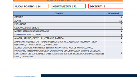 Su 1988 tamponi effettuati sono stati 114 nuovi casi di positivi al coronavirus in Ciociaria. L’indice di positività si attesta