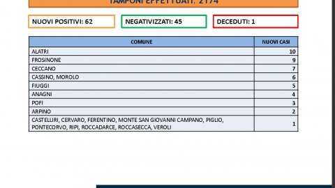 Covid – In Ciociaria 62 nuovi positivi su 2174 tamponi. Un decesso