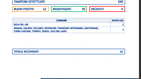 Sono 12 nuovi casi di positivi al Covdi in Ciociaria. I tamponi processati dalla Asl sono stati 345. Il rapporto