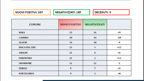 In Ciociaria i nuovi positivi al Covid 19 sono 337, 6 in meno rispetto a mercoledì. Ci sono meno negativizzati,