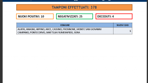 Covid – In Ciociaria pochi tamponi e pochissimi casi, appena 10. Ma ci sono altri 4 decessi