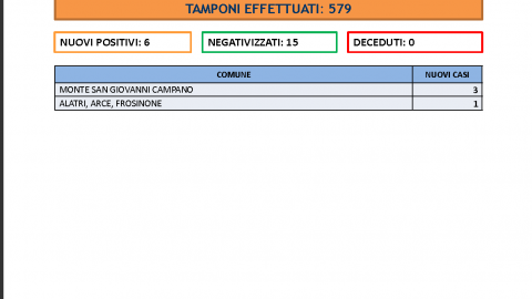 In provincia di Frosinone, nelle ultime 24h, sono stati effettuati 579 tamponi. Sono 6 i nuovi casi di positivi al
