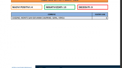 Nelle ultime 24h sono stati effettuati 528 tamponi, in provincia di Frosinone. Sono stati registrati 4 nuovi casi di positivi