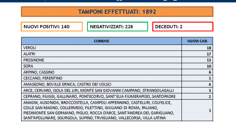 Sono 140 i nuovi positivi al Covid in Provincia di Frosinone su 1892 tamponi processati. Il tasso di positività scende