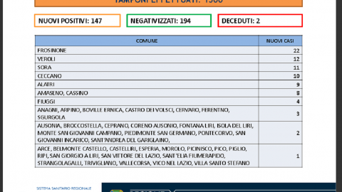 Su 1500 tamponi processati sono 147 i nuovi contagiati dal Covid e 194 i negativizzati in Provincia di Frosinone. L’indice