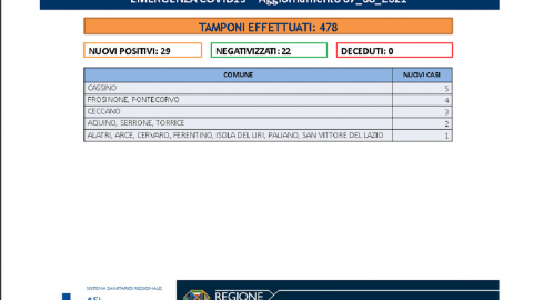Sono 29 i nuovi positivi al Covid in Provincia di Frosinone: i tamponi processati sono stati 478. L’indice è al