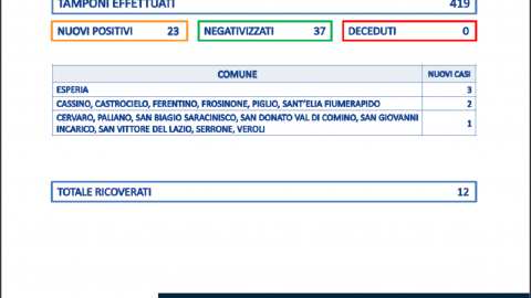 Sono 23 i nuovi positivi al Covid 19 registrati dalla Asl di Frosinone. i tamponi processati sono stati 419. il