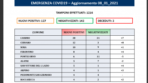 Altri 127 contagi al Covid 19 in Ciociaria su 1216 tamponi processati. Il tasso di positività è al 10,4%. Ci