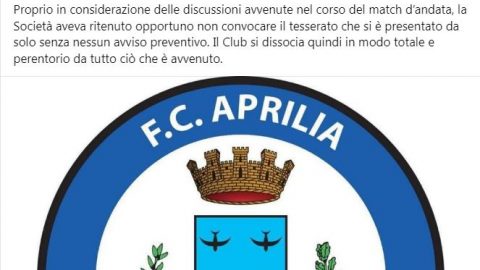 L’Aprilia calcio si dissocia da quanto è successo in occasione della gara dell’U19 Nazionale in casa della Vis Artena dove