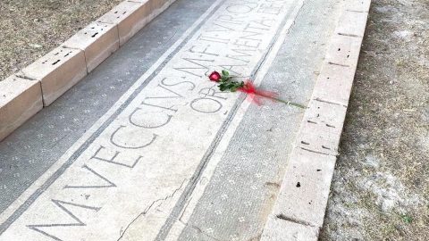 Tre rose rosse adagiate nel frigidarium maschile nel bel mezzo delle terme vecciane all’interno dell’area archeologica di Aquinum. una per