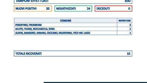 Venti nuovi positivi su un totale di 830 tamponi effettuati in provincia di Frosinone. Rialzo dei casi, ma anche del