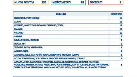 Su circa 2000 tamponi (2059) scendono i casi in Ciociaria, che si attestano a 255. Resta stabile il tasso di