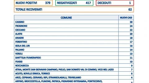 I nuovi positivi al Covid in provincia di Frosinone sono 379, superati dal numero odierno dei guariti che sono 417.
