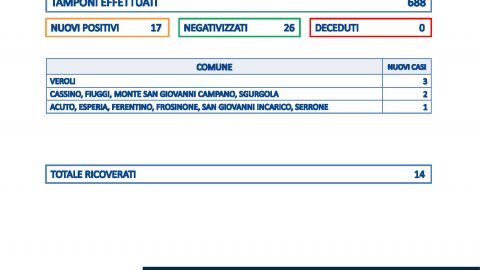 In provincia di Frosinone sono 17 i nuovi casi positivi al Covid nelle ultime 24 ore. Il tutto con un
