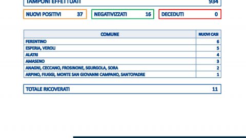 Sono 29 i nuovi casi positivi al Covid in provincia di Frosinone su un totale di 932 tamponi effettuati. Il
