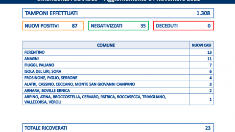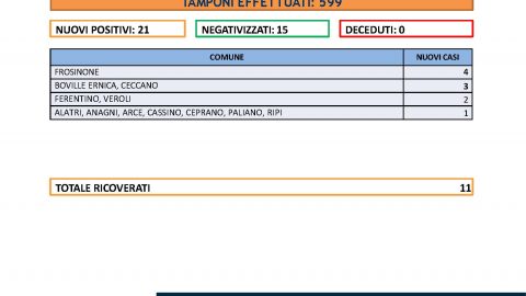 Ventuno nuovi casi e due ricoverati in più. E’ questo il risultato del bollettino giornaliero Covid della Asl di Frosinone