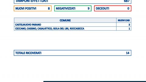 Sono otto i nuovi casi positivi al Covid in provincia di Frosinone, con un numero comunque alto di tamponi: 687.