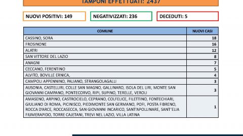 Ancora alto il numero delle vittime Covid in provincia di Frosinone in 24 ore. Sono cinque i decessi comunicati dalla